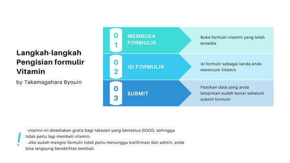 1. Pasien dengan status good diwajibkan meminum vitamin yang disediakan oleh Takamagahara Byouin, dengan cara mengisi formulir berikut Tidak perlu membeli vitamin di apotoik kami, karena sudah disediakan secara gratis